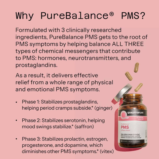 قرص pure balance pms که با سه ماده بالینی مورد بررسی قرار گرفته است، با کمک به تعادل رساندن سه پیام رسان شیمیایی هورمون ها انتقال دهنده های عصبی پروستاگلاندین ها که در pms نقش دارند ریشه های علائم pms را پیدا میکند. دارای سه ماده زنجبيل ، زعفران و عصاره vitex است که باعث رفع گرفتگی ، کاهش تورم و نفخ سینه و همچنین نوسانات خلقی را تثبیت میکند. در نتیجه تسکین موثری را از طیف وسیعی از علائم فیزیکی، احساسی pms ارائه می دهد. همچنین به کاهش دردهای پریودی و نوسانات خلقی کمک می کند و سایر علائم pms را کاهش می دهد.